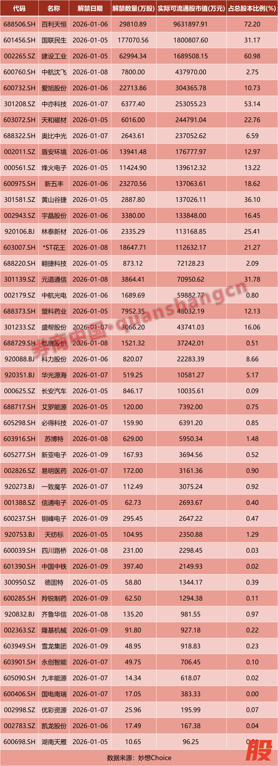 从解禁占比来看,解禁占比居前三位的是:百利天恒(72.2%)、建设工业(60.98%)、中亦科技(53.14%)。