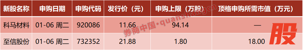 本周(1月5日—1月9日)有2只新股发行,周二:科马材料、至信股份。
