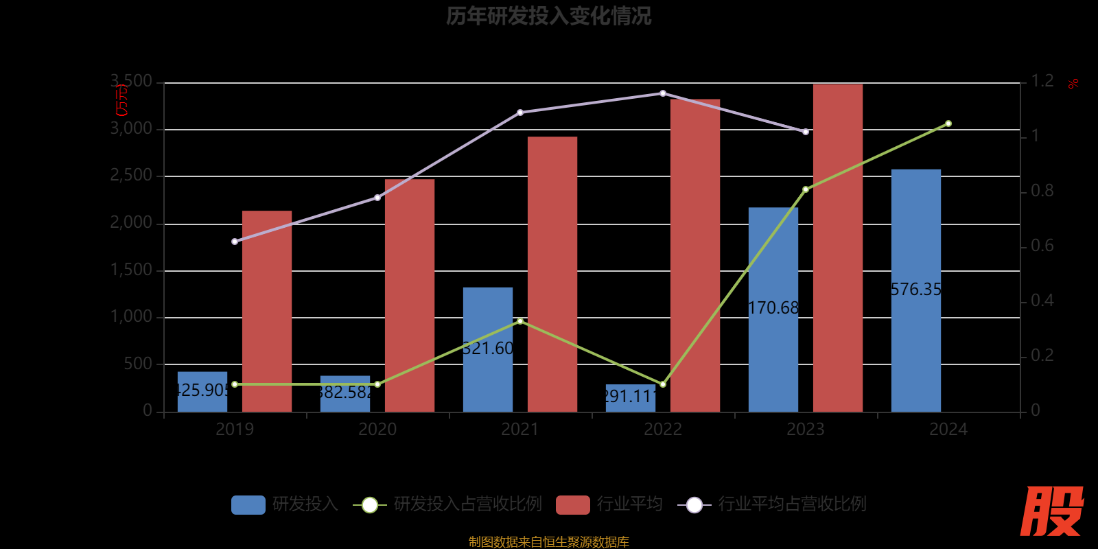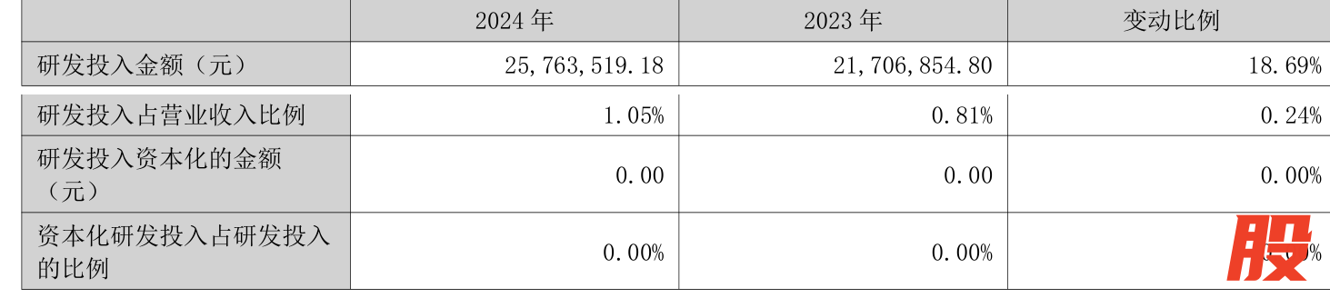 2024年全年,公司研发投入金额为2576.35万元,同比增长18.69%;研发投入占营业收入比例为1.05%,相比上年同期上升0.24个百分点。此外,公司全年研发投入资本化率为0%。