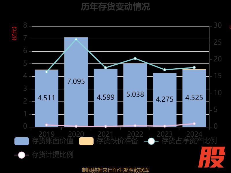 从存货变动来看,截至2024年末,公司存货账面价值为4.52亿元,占净资产的17.64%,较上年末增加2495.41万元。其中,存货跌价准备为432.31万元,计提比例为0.95%。