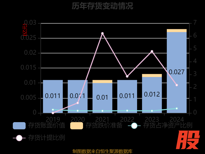 从存货变动来看,截至2024年末,公司存货账面价值为268.38万元,占净资产的0.35%,较上年末增加150.42万元。其中,存货跌价准备为5.94万元,计提比例为2.17%。